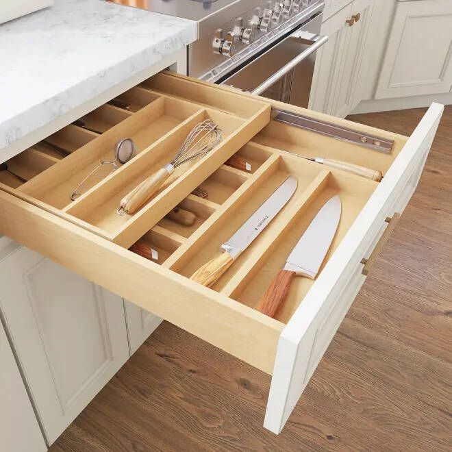 - Custom drawer inserts for utensils, cutlery, and dividers