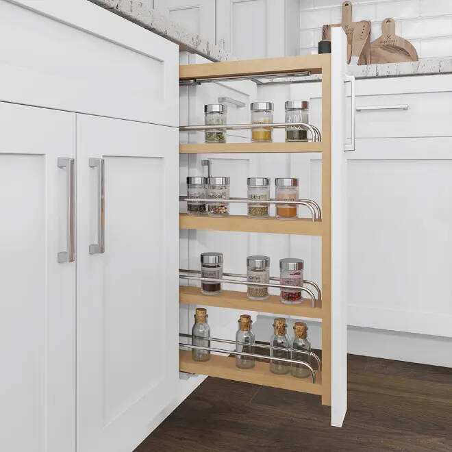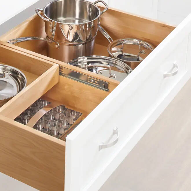 - Built-in spice racks, tray dividers, and cookware organizers